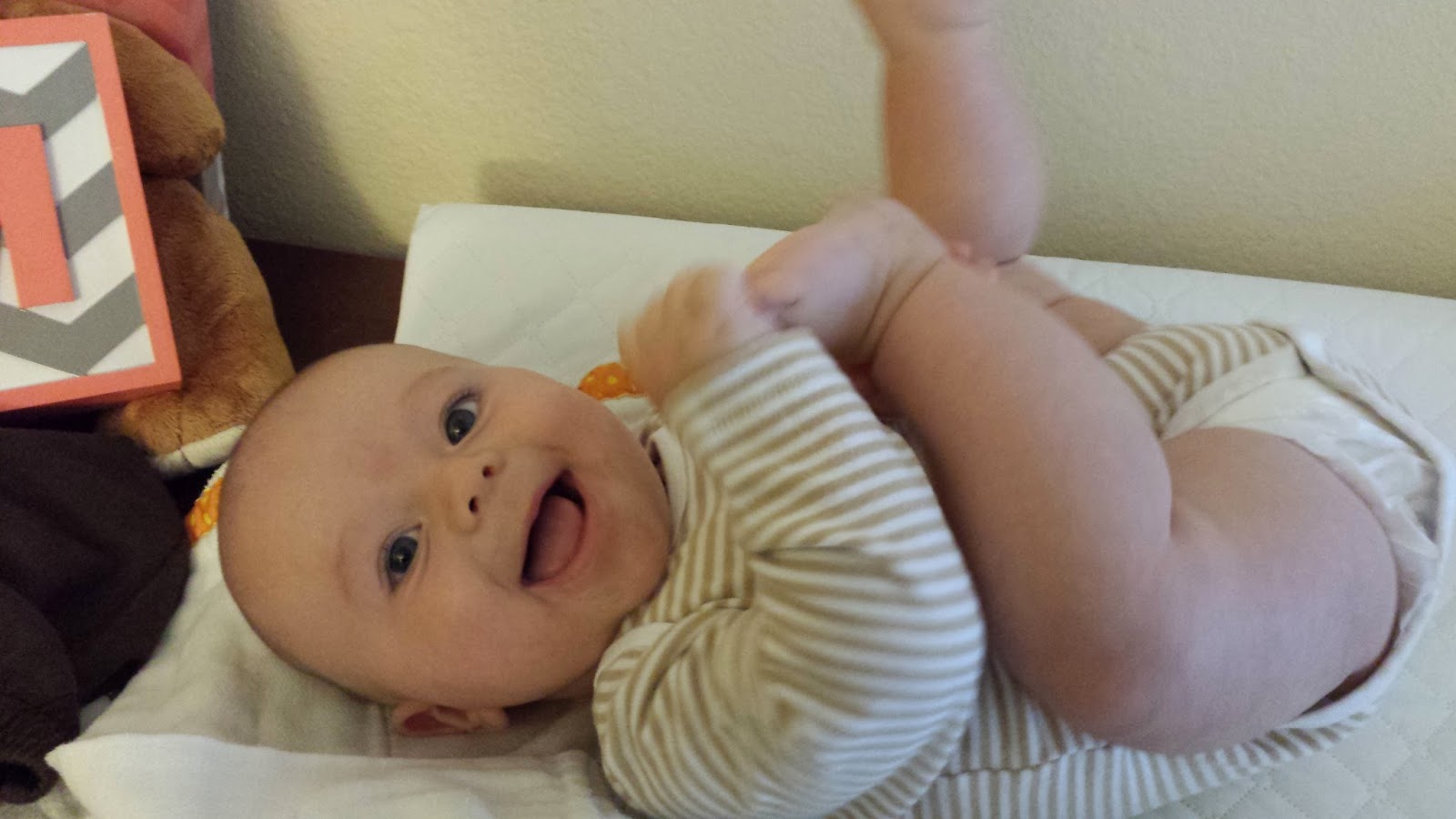 8:06 am - We're awake! I say good morning to Marshall and let him play with his toes on the bed while I brush my teeth and put in my contacts. Diaper change, another meal for M, and then he poops again! We head into his room for a diaper/outfit change and talk and play while he's on the changing pad. Lots of smiles and laughs today!